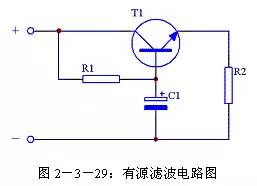 當對濾波效果要求較高時,可以通過增加濾波電容的容量來提高濾波效果。但是受電容體積限制,又不可能無限制增大濾波電容的容量,這時可以使用有源濾波電路。其電路形式見圖2-3-29,其中電阻R1是三極管T1的基極偏流電阻,電容C1是三極管T1的基極濾波電容,電阻R2是負載。這個電路實際上是通過三極管T1的放大作用,將C1的容量放大β倍,即相當于接入一個(β+1)C1的電容進行濾波。
