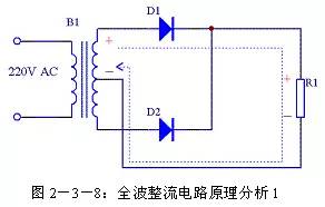 由圖2-3-13可以看出在電源正半周時,B1次級上端為正,下端為負,整流二極管D4和D2導通,電流由變壓器B1次級上端經過D4、R1、D2回到變壓器B1次級下端;由圖2-3-14可以看出在電源負半周時,B1次級下端為正,上端為負,整流二極管D1和D3導通,電流由變壓器B1次級下端經過 D1、R1、D3回到變壓器B1次級上端。R1兩端的電壓始終是上正下負,其波形與全波整流時一致。
