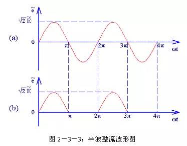 半波整流電路見圖2-3-2。其中B1是電源變壓器,D1是整流二極管,R1是負載。B1次級是一個方向和大小隨時間變化的正弦波電壓,波形如圖 2-3-3(a)所示。0~π期間是這個電壓的正半周,這時B1次級上端為正下端為負,二極管D1正向導通,電源電壓加到負載R1上,負載R1中有電流通過;π~2π期間是這個電壓的負半周,這時B1次級上端為負下端為正,二極管D1反向截止,沒有電壓加到負載R1上,負載R1中沒有電流通過。在 2π~3π、3π~4π等后續(xù)周期中重復上述過程,這樣電源負半周的波形被“削”掉,得到一個單一方向的電壓,波形如圖2-3-3(b)所示。由于這樣得到的電壓波形大小還是隨時間變化,我們稱其為脈動直流。