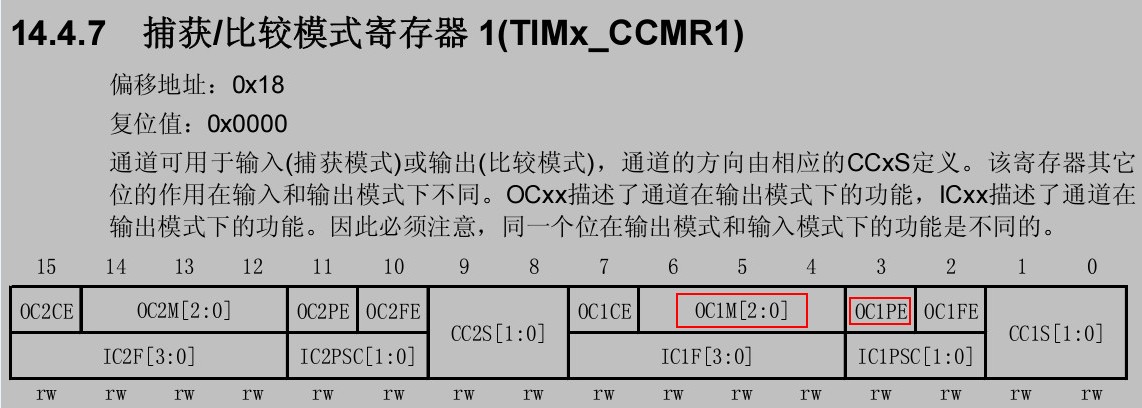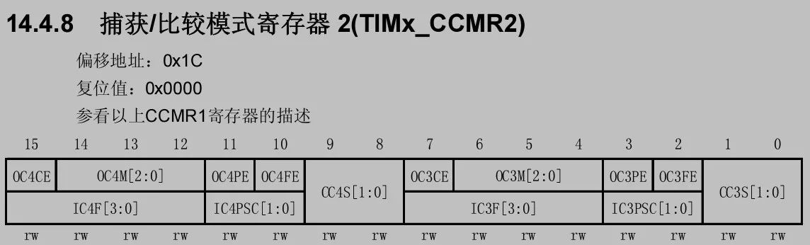 注:TIMX_CCMR1決定CH1~CH2路,TIMX_CCMR2決定CH3~CH4路。