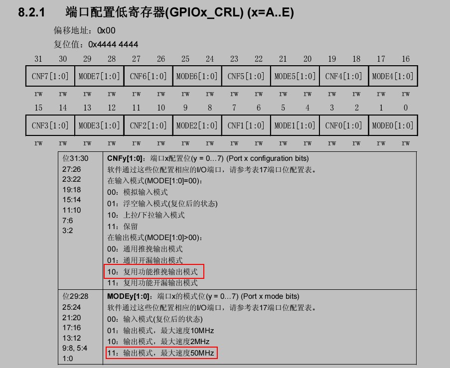 GPIOA->CRL &= 0XF0FFFFFF;//PA6清0GPIOA->CRL |= 0X0B000000;//復用功能輸出(推挽50MHz輸出)GPIOA->ODR |= 1