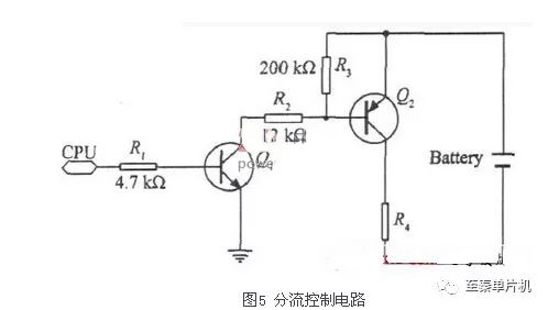 式(5) 可知,該測量電路的電壓增益只與電阻R1 ,R2 的阻值有關(guān),與光耦的電流傳輸參數(shù)等無關(guān),從而實現(xiàn)了對電壓信號的線性隔離。經(jīng)如圖所示電路轉(zhuǎn)化后電池電壓被轉(zhuǎn)化為具有統(tǒng)一參考地的輸出電壓Vout 。4、部分分流控制電路如圖5 分流控制電路所示,充電過程中,當(dāng)某一單體電壓明顯高于組內(nèi)其他電池時,CPU 將控制端口拉高,則Q1 導(dǎo)通,Q2 基極電位被拉低,Q2 導(dǎo)通,部分電能從旁路電阻R4 分流,降低該電池充電速率,從而實現(xiàn)電池組各單體電池充電速率同步。