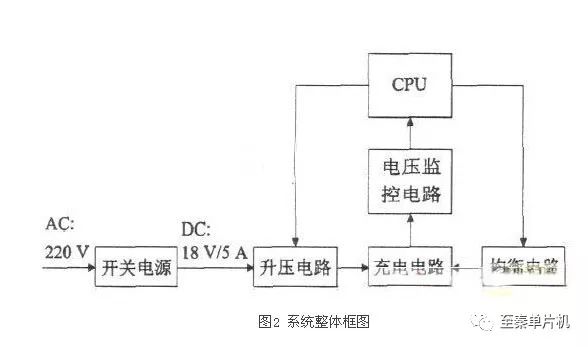 系統(tǒng)設(shè)計及分析1、系統(tǒng)整體結(jié)構(gòu)如圖2 系統(tǒng)框圖所示,工頻交流電通過開關(guān)電源轉(zhuǎn)化為18 V/ 5 A 的直流電輸出給升壓電路,升壓電路根據(jù)CPU 的控制信號為電池組充電提供一定的充電電流,電壓監(jiān)控電路將電池的實時電壓情況反饋給CPU ,CPU 通過升壓電路實現(xiàn)對電池組整體充電電壓、電流的控制。通過均衡電路實現(xiàn)各個單體電池充電速率調(diào)整,以保證整個電池組充電的一致性。