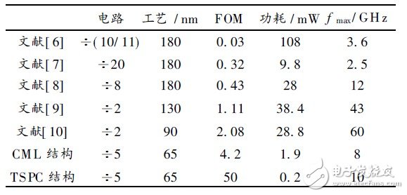 式中: fmax 是分頻器的最高工作頻率; P 是分頻器在最高工作頻率下的功耗, 表2 為本文設(shè)計的分頻器和其他文獻(xiàn)中介紹的分頻器作對比,所有的分頻器均采用CMOS工藝, 對比表明本文設(shè)計的5 分頻器性能較優(yōu),在65 nm 工藝下具有明顯的功耗低優(yōu)勢, 尤其是采用TSPC 電路結(jié)構(gòu)的分頻器, 功耗極低。