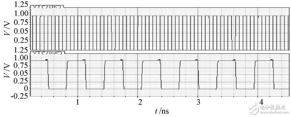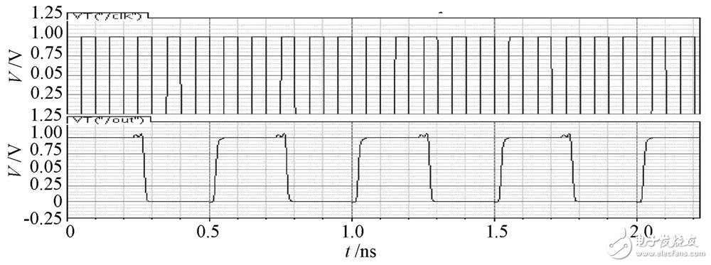 本文基于65 nm 工藝分別采用CML 電路結(jié)構(gòu)和TSPC 電路結(jié)構(gòu)設(shè)計了1 個五分頻器, 采用spectre仿真表明, 采用CML 結(jié)構(gòu)的分頻器最高工作頻率8 GHz,功耗1. 7 mW, 輸出信號占空比49. 76% ; 采用T SPC 電路結(jié)構(gòu)分頻器最高工作頻率10 GHz, 功耗為0. 2 mW,輸出信號占空比49. 91%, 由于采用單端輸入輸出, 所以采用T SPC 結(jié)構(gòu)的分頻器抗噪聲能力較弱。輸出信號占空比為50% 是本文一大特點(diǎn), 2 種結(jié)構(gòu)的分頻器工作頻率完全覆蓋了USB 3. 0 協(xié)議所要求的頻率范圍,滿足協(xié)議要求。