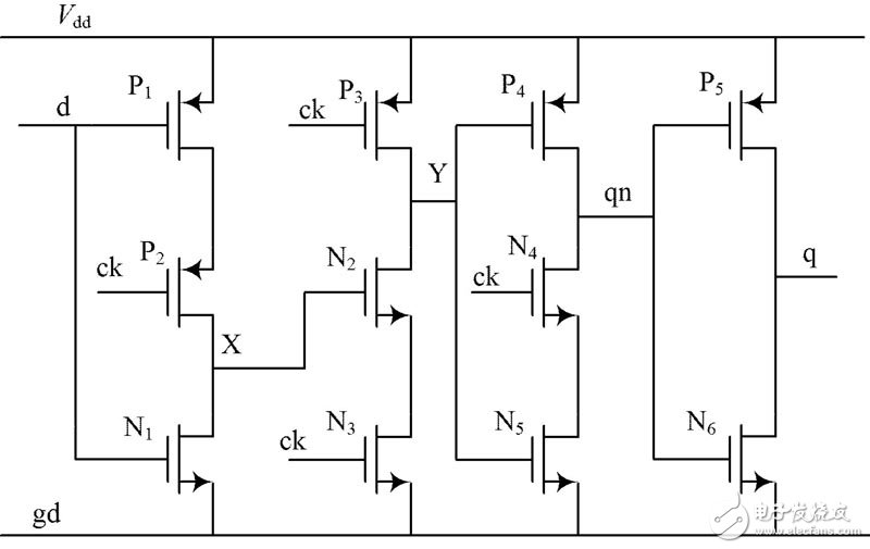 TSPC 電路構(gòu)成的觸發(fā)器如圖3 所示, 由圖中可以看出, 該電路由四級反相器構(gòu)成, 上升沿觸發(fā), 當(dāng)CK 為低電平, 輸入反相器在節(jié)點(diǎn)X 上采樣反向d 輸入,第2 級反相器處于保持狀態(tài), 節(jié)點(diǎn)Y 預(yù)充電至V dd,第三級反相器處于保持狀態(tài), 時鐘上升沿來時, 第二級反相器求值, Y 的電平值發(fā)生變化, 時鐘ck 為高電平時,節(jié)點(diǎn)Y 的值傳送到輸出q, 該觸發(fā)器的延時為4 個反相器的傳播延時, 由于電路中元件數(shù)目很少, 而且采用動態(tài)邏輯, 因此功耗極低。