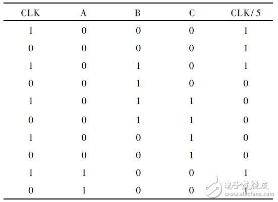 采用基于D 觸發(fā)器結(jié)構(gòu)的五分頻器邏輯框圖如圖1所示。圖1 由3 個D 觸發(fā)器和少量邏輯門構(gòu)成, 采用了同步工作模式, 其原理是由吞脈沖計數(shù)原理產(chǎn)生2 個占空比不同的五分頻信號A 和B, 然后對時鐘信號CLK, A 和B 進(jìn)行邏輯運(yùn)算得到占空比為50% 的五分頻信號CLK/ 5, 其計數(shù)過程如表1 所示, 從表1 的計數(shù)過程可知, 分頻后的時鐘CLK/ 5 的周期是輸入時鐘CLK 的5 倍, 由此實(shí)現(xiàn)了五分頻并且其占空比為50% 。