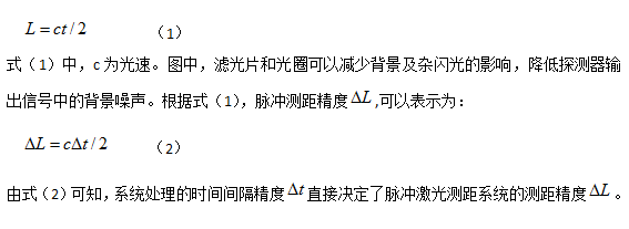 人機(jī)操作發(fā)出測距指令,出發(fā)激光器發(fā)出激光脈沖,一小部分能量透過分束片,作為參考脈沖直接送到脈沖采集系統(tǒng),作為計時的起始點(diǎn),啟動數(shù)字式測距計時器開始計時:另一部分由折射棱鏡放射,射向目標(biāo)。一般發(fā)射前端有望遠(yuǎn)光學(xué)系統(tǒng),為的是減少出射光束的發(fā)散角,以提高光能面密度,增大工作距離,還可以減少背景和周圍非目標(biāo)標(biāo)物的干擾。到達(dá)目標(biāo)的激光束有一部分被表面漫反射回到測距儀;經(jīng)接收物鏡和光學(xué)濾波器,到達(dá)探測器APD,窄帶光學(xué)濾波器的主要作用是充分利用激光優(yōu)良的單色性,提高系統(tǒng)的信噪比;光探測器APD將光學(xué)信號轉(zhuǎn)換為電信號,然后將電信號進(jìn)行信號放大、濾波整形。整形后的回波信號關(guān)閉時間間隔處理模塊,使其停止計時。這樣,根據(jù)時間間隔處理的結(jié)果t即可計算出待測目標(biāo)的距離L為: