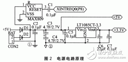 這個(gè)電源回路除了可以提供5v和3.3v的電源以外,還為系統(tǒng)掉電保護(hù)提供了延時(shí)及預(yù)警功能,通過軟件的配合可以實(shí)現(xiàn)系統(tǒng)的掉電保護(hù)機(jī)制。正常情況下,由供電回路1給整個(gè)系統(tǒng)供電。當(dāng)系統(tǒng)由于意外原因掉電時(shí),由于輸入的比較電壓降低,這樣MAX809 模塊輸出電壓產(chǎn)生翻轉(zhuǎn)為系統(tǒng)提供掉電中斷預(yù)警信號,中斷請求通過外部中斷引腳XREQ0產(chǎn)生;同時(shí)供電回路2開始啟用。通過大電容C3、c4放電,繼續(xù)為系統(tǒng)提供一段供電電壓,支持掉電中斷服務(wù)程序完成。供電回路2只給最小系統(tǒng)供電,并不給耗電量大的外圍部件供電。這樣,給最小系統(tǒng)的供電時(shí)間足夠長,可以完成敏感數(shù)據(jù)的保護(hù)操作。