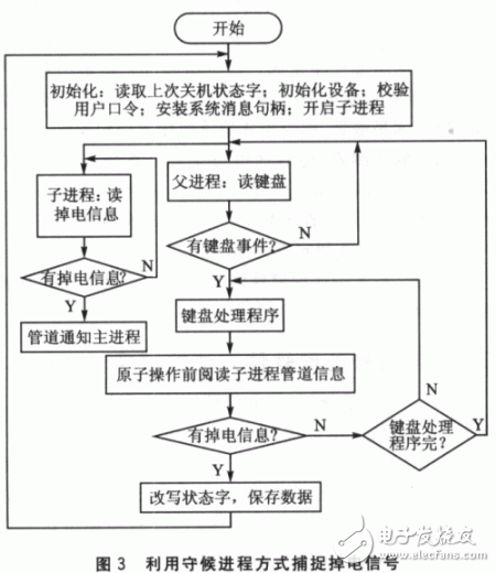 另一種方式是采用守候進(jìn)程的方式,開通一個(gè)進(jìn)程,此進(jìn)程專門等待中斷信號。主程序根據(jù)數(shù)據(jù)操作對象的不同,將自己的流程方案劃分成若干原子操作,所謂原子操作即劃定的程序塊要么完全執(zhí)行,要么不執(zhí)行。每個(gè)操作對應(yīng)惟一狀態(tài)標(biāo)志。在每個(gè)原子操作前,主進(jìn)程都將會通過管道通信的方式閱讀中斷信號。如果中斷信號產(chǎn)生,主進(jìn)程首先保存狀態(tài)標(biāo)志,然后將相關(guān)數(shù)據(jù)寫往Flash后退出,電源恢復(fù)后,主進(jìn)程首先根據(jù)標(biāo)志字確定系統(tǒng)恢復(fù)方案。圖3用流程圖的方式實(shí)現(xiàn)這一過程。