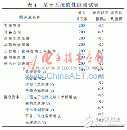 對大型軟件的所有模塊均考察測試點的最大并發(fā)數(shù)和響應時間指標,其中某子系統(tǒng)的性能測試表如表4所示。