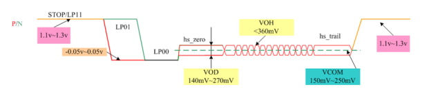 是不是美如畫。而mipi的信號符合其通信協(xié)議,規(guī)定其起始電壓在1.1~1.3V,等等,如下圖(我比較懶,不服來辯)。這是其電氣要求。