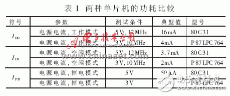 表1列出了兩種單片機(jī)(Intel的80C31和Philips的P87LPC764)的低功耗特性。