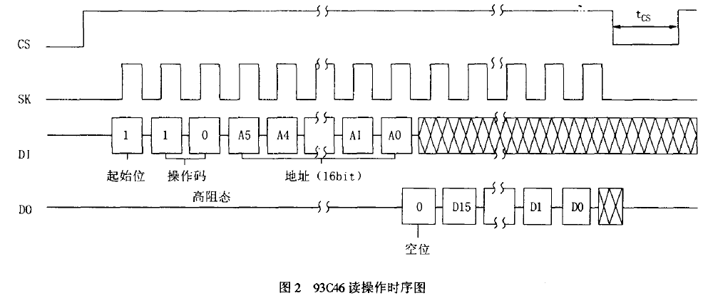 93CA6作為從設備,其SPI接口使用4條I/O口線:串行時鐘線(SK)、輸出數(shù)據(jù)線DO、輸入數(shù)據(jù)線DI和高電平有效的從機選擇線CS。其數(shù)據(jù)的傳輸格式是高位(MSB)在前,低位(LsB)在后。93C46的SPI總線接口讀命令時序如圖2所示。
