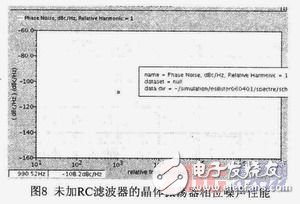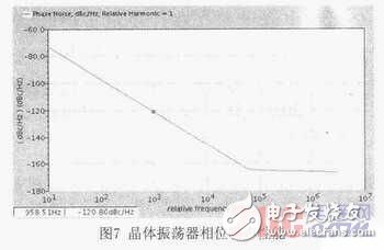 對(duì)加RC濾波器之前的晶體振蕩器進(jìn)行仿真,起振時(shí)間振蕩幅度都基本沒有改變。但其相位噪聲性能如圖8所示,在偏離中心頻率1kHz、10kHz、1MHz處的相位噪聲分別為:-110dBc/Hz、-127dBc/Hz、-143dBc/Hz。