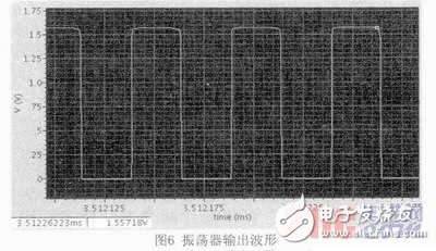 利用Cadence Spectre軟件工具對(duì)晶體振蕩器進(jìn)行仿真,其輸出波形如圖6所示的方波,峰峰值為1.56V,起振時(shí)間約為0.6ms。圖7表示的是振蕩器的相位噪聲性能,在偏離中心頻率1kHz、10kHz、1MHz處的相位噪聲分別為:-121dBc/Hz、-145dBc/Hz、165dBc/Hz。