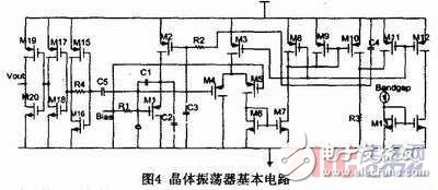 在起振之后輸出電壓振幅不斷增大,M4、M5的反向交流電流也按尺寸比例分配,使通過兩者的平均電流不斷接近,當(dāng)振蕩幅度達(dá)到一定大小時(shí),兩個(gè)管子平分M3的電流。此時(shí)M8不足以提供M5的電流,M9就進(jìn)入飽和態(tài)導(dǎo)通補(bǔ)足所需的電流,同樣M10也導(dǎo)通,所以流過R3的電流增大變?yōu)镮10+I11,M2的柵源電壓變小,從而M2的電流下降,振蕩器趨于穩(wěn)定,輸出幅度穩(wěn)定下來。R3和C4決定振幅控制電路的時(shí)間常數(shù),它的值太小會(huì)引入幅度波動(dòng),太大則會(huì)使響應(yīng)過慢,需要進(jìn)行折衷考慮。