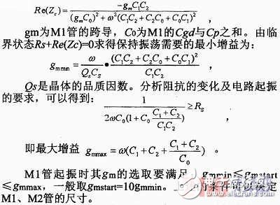 振蕩器的核心振蕩電路由M1、M2、C1、C2以及石英晶體組成。晶體管M1作為振蕩主管,M2管作為偏置電流源,振蕩器的輸出在M1管的柵端。為了得到比較理想的頻率偏移,C1、C2都取得比較大,分別為5p、10p。利用上節(jié)提到的負(fù)阻抗模型,對(duì)該電路進(jìn)行分析,可得: