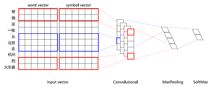 單純以 word vector 為輸入的 CNN 分類效果,在某些領(lǐng)域上無法超越復(fù)雜特征工程的 SVM 分類器。如何進一步提升深度學習的效果,其中一個探索方向就是試圖把分布式表示和符號表示進行融合。比如對于「劉德華的忘情水」這句話,通過知識庫可以標注劉德華為 singer、忘情水為 song,期望能把 singer 和 song 這樣的符號表示融入到網(wǎng)絡(luò)中去。具體融合方法,既可以把符號標簽進行 embedding,然后把 embedding 后的 vector 拼接到 word vector 后進行分類,也可以直接用 multihot 的方式拼接到 word vector 后面。分布式表示和符號表示融合后的 CNN 結(jié)構(gòu)如圖 6 所示。