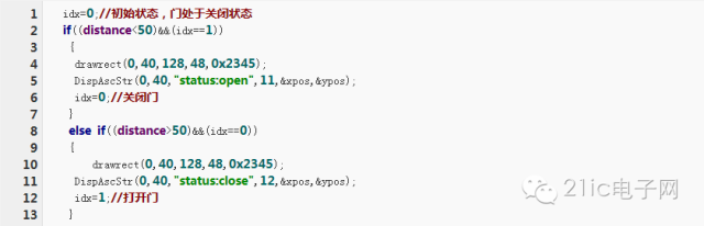 idx=0;//初始狀態(tài),門處于關(guān)閉狀態(tài)if((distance<50)&&(idx==1)){drawrect(0,40,128,48,0x2345);DispAscStr(0,40,"status:open",11,&xpos,&ypos);idx=0;//關(guān)閉門}else if((distance>50)&&(idx==0)){drawrect(0,40,128,48,0x2345);DispAscStr(0,40,"status:close",12,&xpos,&ypos);idx=1;//打開門}