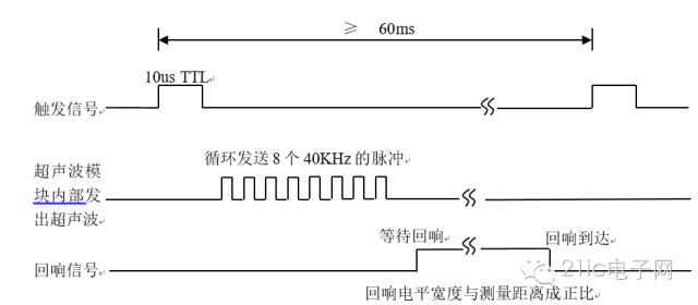 一個 10us 以上脈沖觸發(fā)信號,該模塊內(nèi)部將發(fā)出 8次40KHz 周期電平并檢測回波。一旦檢測到有回波信號則輸出回響信號,回響信號的脈沖寬度與所測的距離成正比。由此通過發(fā)射信號到收到的回響信號的時(shí)間間隔可以計(jì)算得到距離。建議測量周期為 60ms 以上,以防止發(fā)射信號對回響信號的影響。