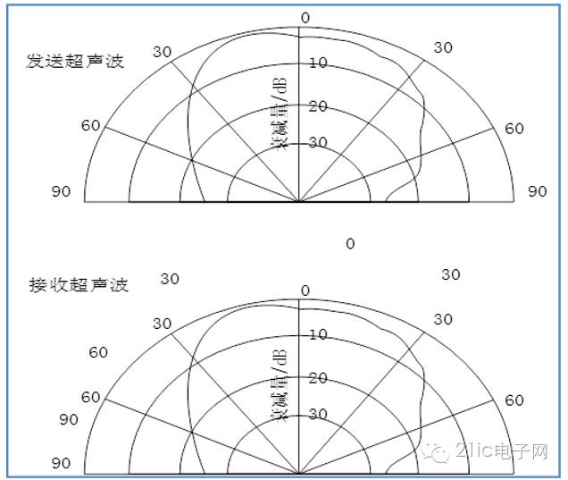 圖4 傳感器的方向圖(5)控制方式本模塊使用方法簡單,通過嵌入式微處理器控制口發(fā)一個10us以上的高電平,啟動超聲波傳感器模塊發(fā)出8個40KHz的周期電平。然后開啟定時(shí)器,再延時(shí)100us左右以避免發(fā)射探頭的余振的干擾。接著通過在while循環(huán)中查詢外部中斷是不是已經(jīng)捕獲到回波信號,一旦檢測到有回波信號則輸出回響信號?;仨懶盘柕拿}沖寬度與所測的距離成正比。由此通過發(fā)射信號到接收到的回響信號的時(shí)間間隔就可以計(jì)算得到距離。