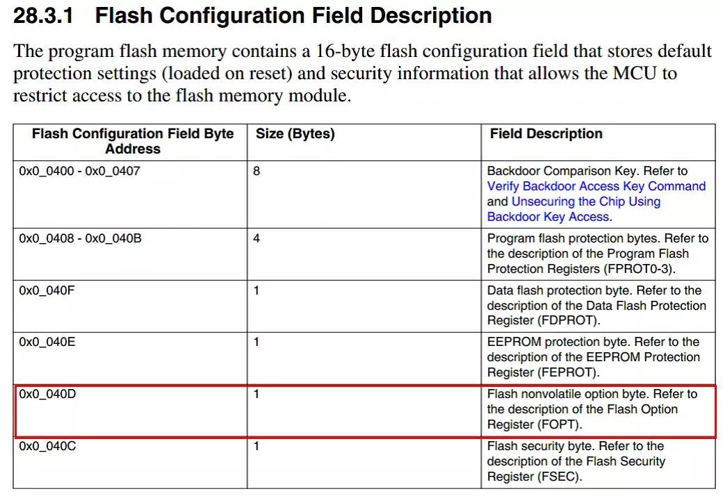 K20系列MCU的FOPT寄存器的描述如下圖所示,具體查看相應(yīng)MCU參考手冊(cè)的Reset and Boot章的Boot節(jié)的FOPT boot options小節(jié)。