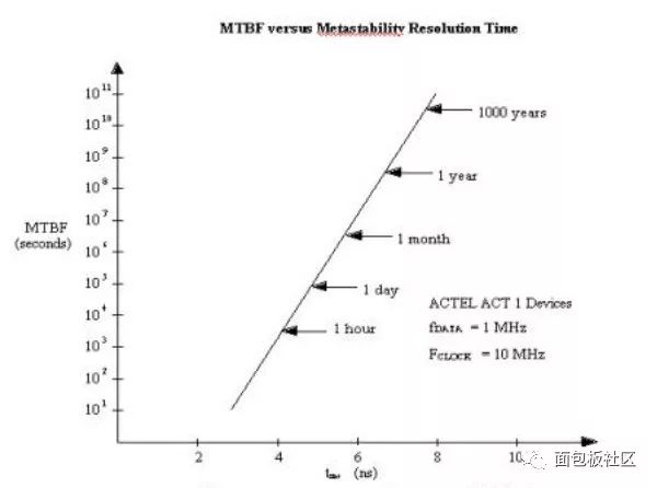 使用同步電路以后,亞穩(wěn)態(tài)仍然有發(fā)生的可能,與此相連的是MTBF(Mean Time Between Failure),亞穩(wěn)態(tài)的發(fā)生概率與時(shí)鐘頻率無關(guān),但是MTBF與時(shí)鐘有密切關(guān)系。 有文章提供了一個(gè)例子,某一系統(tǒng)在20MHz時(shí)鐘下工作時(shí),MTBF約為50年,但是時(shí)鐘頻率提高到40MHz時(shí),MTBF只有1分鐘!可見降低時(shí)鐘頻率可以大大減小亞穩(wěn)態(tài)導(dǎo)致系統(tǒng)錯(cuò)誤的出現(xiàn),其原因在于,提供較長的resolution time可減小亞穩(wěn)態(tài)傳遞到下一級(jí)的機(jī)會(huì),提高系統(tǒng)的MTBF,如圖2所示。