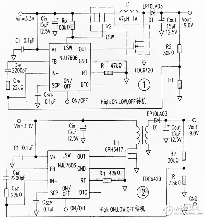 最近廠家生產(chǎn)出了帶負(fù)載切斷功能的升壓型變換器IC,使用時(shí)采用圖1所示的電路。在待機(jī)時(shí)借助于P溝道MOSFET Tr2的截止,切斷輸入端和輸出端的直流通路。