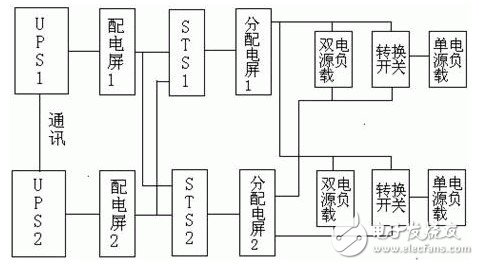 此種UPS供電方式,最大的好處是可以負(fù)載均分,其中任意一臺(tái)UPS故障,其被切離,UPS系統(tǒng)不用做任何切換,仍可工作在在線模式??梢愿鶕?jù)負(fù)載量,通過增加UPS的方式實(shí)現(xiàn)系統(tǒng)容量擴(kuò)充。系統(tǒng)圖見圖2。