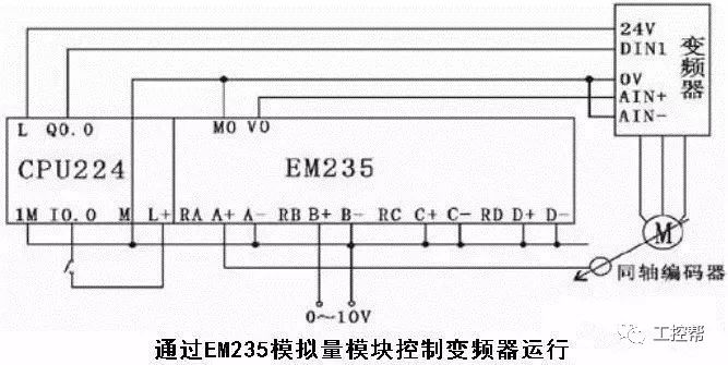 這種控制方式接線簡單,但需要選擇與變頻器輸入阻抗匹配的PLC輸出模塊,且PLC的模擬量輸出模塊價(jià)格較為昂貴,此外還需采取分壓措施使變頻器適應(yīng)PLC的電壓信號(hào)范圍,在連接時(shí)注意將布線分開。