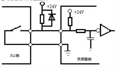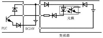 當(dāng)輸進(jìn)開關(guān)信號(hào)進(jìn)進(jìn)變頻器時(shí),有時(shí)會(huì)發(fā)生外部電源和變頻器控制電源(DC24V)之間的串?dāng)_。正確的連接是利用PLC電源,將外部晶體管的集電極經(jīng)過二極管接到PLC。如圖4所示。