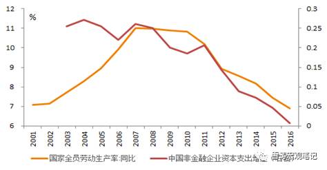 圖2:中國勞動生產(chǎn)率 VS 非金融企業(yè)資本支出增速:5年移動平均