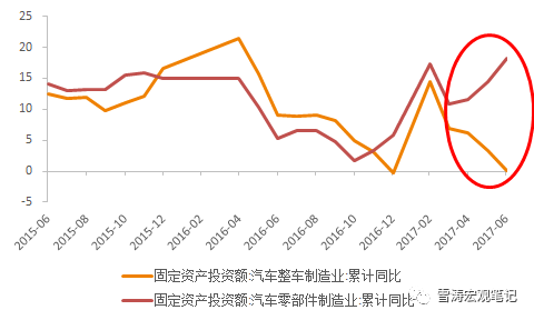 一輛新能源汽車的整車制造成本只占28%,而零部件成本占到72%;相比之下,一輛燃油汽車的零件成本只占50%左右。新能源車的技術(shù)核心是“三電”(電驅(qū)動、電池、電控)等零件而非整車。當2017年新能源汽車銷售走高后,汽車零部件和整車制造的固定資產(chǎn)投資出現(xiàn)背離。汽車零配件固定資產(chǎn)投資迅速增長,從3月的10.9%上升至6月的18.3%,而整車固定資產(chǎn)投資降至0。