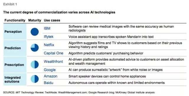 圖1:AI 技術(shù)當(dāng)下的商業(yè)化,麥肯錫認為,IBM 和訊飛的商業(yè)應(yīng)用屬于感知技術(shù)。而百度和亞馬遜則是結(jié)合硬件的解決方案。