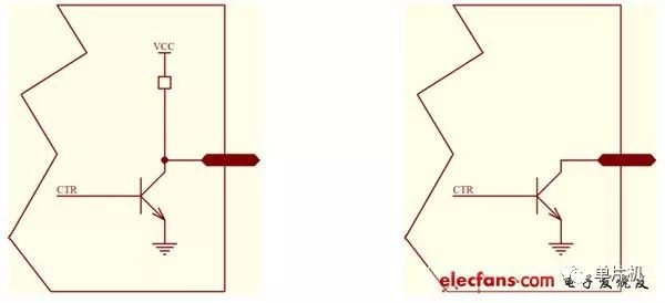 P1,P2,P3口都可以理解成左圖,注意vcc下面有個電阻,因此可以理解成:引腳輸出1的能力弱。地那邊沒有電阻,可以理解成引腳吸入電流能力強(qiáng)。而P0口,可以理解成右圖。這就是集電極開路輸出,也叫OC輸出??梢钥闯?,當(dāng)CTR=1時,三極管導(dǎo)通,引腳被接地;當(dāng)ctr=0時,三極管截止,引腳浮空,也叫三態(tài)。這個端口這么做的目的是考慮P0口肩負(fù)讀寫數(shù)據(jù)和地址復(fù)用,這個關(guān)系要仔細(xì)看懂cpu時序圖。因此,P0口要加合適的上拉電阻,絕不要加下拉電阻。上拉電阻的選擇要看外部負(fù)載情況。