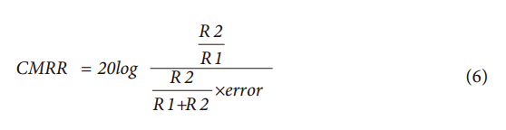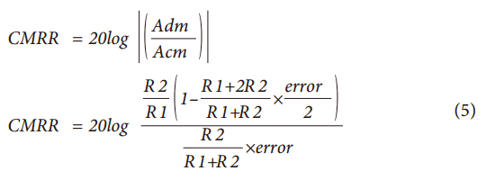 從等式4可見,當(dāng)電阻值不存在誤差(即error = 0)時,則 Acm = 0,放大器僅對差分電壓作出響應(yīng),則為: