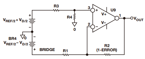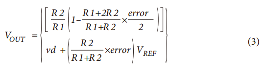 電阻R2的公差引起的誤差為R2 (1 – error)。通過疊加原理,同時使R1 = R3,R2 = R4,在計(jì)算并進(jìn)行排列之后,輸出電壓(VOUT)為: