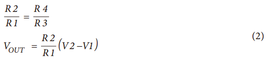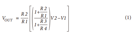 輸出等于兩個輸入之差乘以增益系數(shù),該系數(shù)可設(shè)定為1.當(dāng)電阻比匹配良好時,等式2成立。假定完美匹配電阻值 分別為:R2 = R4 = 10 kΩ,R1 = R3 = 1 kΩ,V1 = 2.5 V, V2 = 2.6 V,則有VOUT= 1 V.