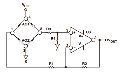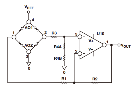圖1為采用一個典型的由單放大器構(gòu)建的差動放大器,該放大器與一個傳感器橋路相連。