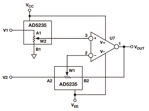 ? d.作為對精度要求不高的電路的替代途徑,可使用數(shù)字電位計(jì),如圖7所示。AD5235(一種非易失性存儲器、雙路 1024 位數(shù)字電位計(jì))配合AD8628構(gòu)成一種差動放大器,其增益為15(G = 15)。