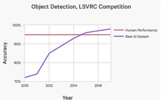 根據(jù)LSVRC競賽結(jié)果,圖像標(biāo)注的誤差率從2010年的28.5%降至低于 2.5%;