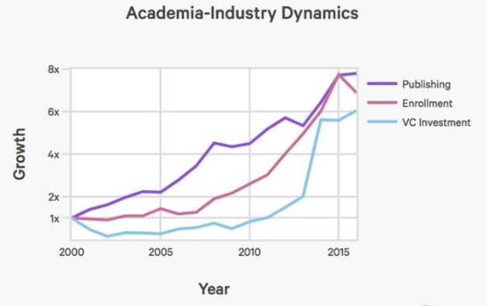 ▲學(xué)術(shù)-產(chǎn)業(yè)動態(tài)關(guān)系(參數(shù)包含論文出版、學(xué)業(yè)課程、投資金額,其中2016年學(xué)生課程參與度的下降是由于行政原因)