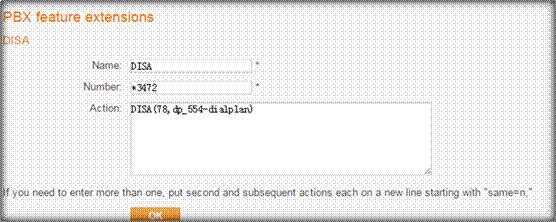 Action:DISA(78,dp_554-dialplan) //密碼為78 ,利用554分機號的外線出局