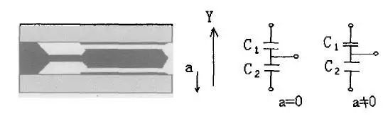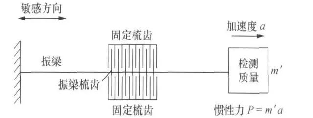 一根琴弦繃緊程度不同時彈奏出的聲音頻率也不同,諧振式加速度計的原理與此相同。振梁一端固定,另一端鏈接一質量塊,當振梁軸線方向有加速度時梁會受到軸線方向的力,梁中張力變化,其固有頻率也相應發(fā)生變化。若對梁施加一確定的激振,檢測其響應就可測出其固有頻率,進而測出加速度。激振的施加和響應的檢測通常都是通過梳齒機構實現(xiàn)的。