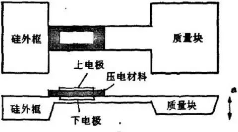 壓電式加速度計利用了壓電效應,或者更確切地說,是利用了正壓電效應,即某些電介質在沿一定方向上受到外力的作用而變形時其內部產生極化現(xiàn)象,同時在它的兩個相對表面上出現(xiàn)正負相反的電荷。通過測量壓電材料兩級的電勢差即可求得其形變壓電原理在宏觀尺度的加速度計中應用頗為廣泛,這類加速度計的構造多為基座和質量塊之間夾一壓阻材料(如下圖)。