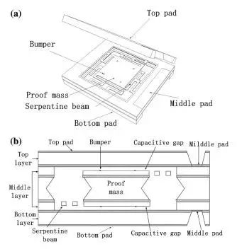 當前大多數(shù)的電容式加速度傳感器都是由三部分硅晶體圓片構成的,中層是由雙層的SOI硅片制成的活動電容極板。如圖所示, 中間的活動電容極板是由八個彎曲彈性連接梁所支撐,夾在上下層兩塊固定的電容極板之間。提高精度很重要的一項措施就是采用差動測量方式,極大地提高了信噪比。因此,電容式MEMS加速度傳感器幾乎全部采用差動結構。