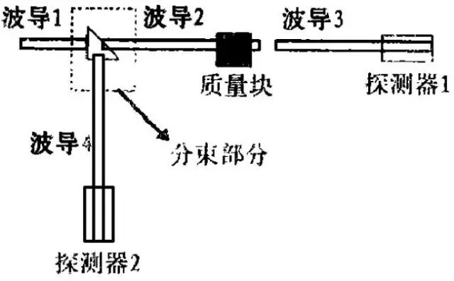 光波導加速度計的原理如下圖所示:光源從波導1進入,經過分束部分后分成兩部分分別通入波導4和波導2,進入波導4的一束直接被探測器2探測,而進入波導2的一束會經過一段微小的間隙后進入波導3,最終被探測器1探測到。有加速度時,質量塊會使得波導2彎曲,進而導至其與波導3的正對面積減小,使探測器1探測到的光減弱。通過比較兩個探測器檢測到的信號即可求得加速度。