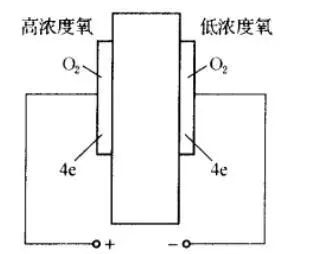 同體電解質(zhì)在高溫下才會有明顯的導(dǎo)電性。氧化鋯(ZrO2)是典型的氣體傳感器的材料。純正的氧化鋯在常溫下是單斜晶結(jié)構(gòu),當(dāng)溫度升到1000℃左右時(shí)就會發(fā)生同質(zhì)異晶轉(zhuǎn)變,由單斜晶結(jié)構(gòu)變?yōu)槎嗑ЫY(jié)構(gòu),并伴隨體積收縮和吸熱反應(yīng),因此是不穩(wěn)定結(jié)構(gòu)。在ZrO2中摻入穩(wěn)定劑如:堿土氧化鈣CaO或稀土氧化釔Y2O3,使其成為穩(wěn)定的熒石立方晶體,穩(wěn)定程度與穩(wěn)定劑的濃度有關(guān)。ZrO2加入穩(wěn)定劑后在l800℃氣氛下燒結(jié),其中一部分鋯離子就會被鈣離子替代,生成(ZrO·CaO)。由于Ca2+是正二價(jià)離子,Zr4+是正四價(jià)離子,為繼續(xù)保持電中性,會在晶體內(nèi)產(chǎn)生氧離子O2-空穴,這是(ZrO·CaO)在高溫下傳遞氧離子的原因,結(jié)果是(ZrO·CaO)在300~800℃成為氧離子的導(dǎo)體。但要真正能夠傳遞氧離子還必須在固體電解質(zhì)兩邊有不同的氧分壓(氧位差),形成所渭的濃差電池。其結(jié)構(gòu)原理如圖所示,兩邊是多孔的貴金屬電極,與中間致密的ZrO·CaO材料制成夾層結(jié)構(gòu)。