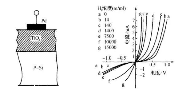 結(jié)型氣敏傳感器件又稱氣敏二極管,這類氣敏器件是利用氣體改變二極管的整流特性來工作的。其結(jié)構(gòu)如下圖左圖所示。它的原理是:貴金屬Pd對氫氣具有選擇性,它與半導(dǎo)體接觸形成接觸勢壘。當(dāng)二極管加正向偏壓時(shí),從半導(dǎo)體流向金屬的電子將增加,因此正向是導(dǎo)通的。當(dāng)加負(fù)向偏壓時(shí),載流子基本沒有變化,這是肖特基二極管的整流特性。在檢測氣氛中,由于對氫氣的吸附作用,貴金屬的功函數(shù)改變,接觸勢壘減弱.導(dǎo)致載流子增多,正向電流增加,二極管的整流特性曲線會發(fā)生左移。下圖右圖為Pd—TiO2氣敏二極管在不同濃度H2的空氣中的特性曲線。因此,通過測量二極管的正向電流可以檢測氫氣濃度。